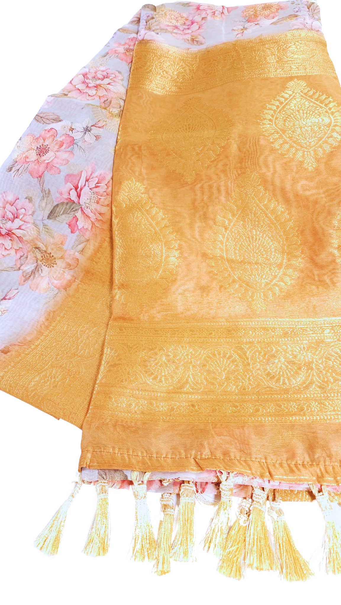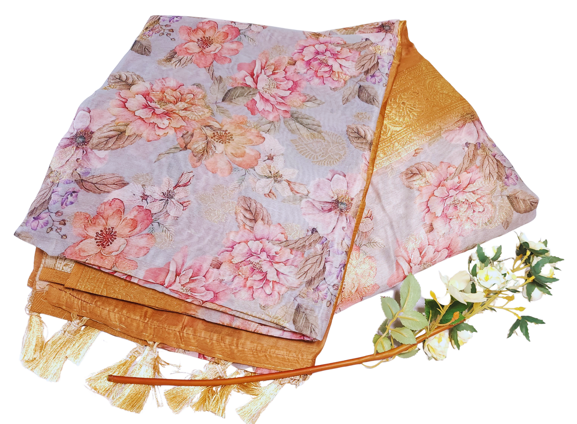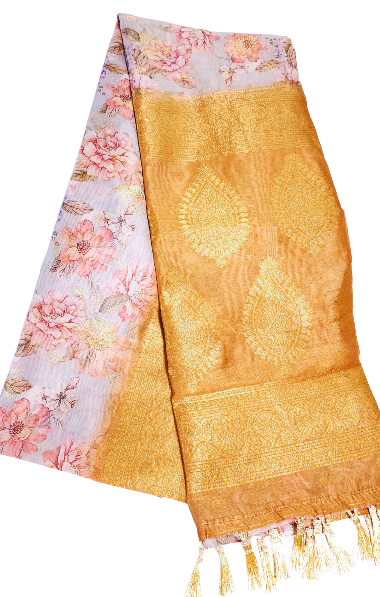 Our exquisite handwoven Burberry saree is a masterpiece of timeless elegance and the delicate floral print adds a touch of grace and charm to your ensemble. The soft, luxurious fabric drapes gracefully. With its subtle blend of tradition and modernity, this saree is a true reflection of sophistication. Drape yourself in the artistry of handwoven Burberry, and let your beauty bloom like the flowers on this enchanting saree.
