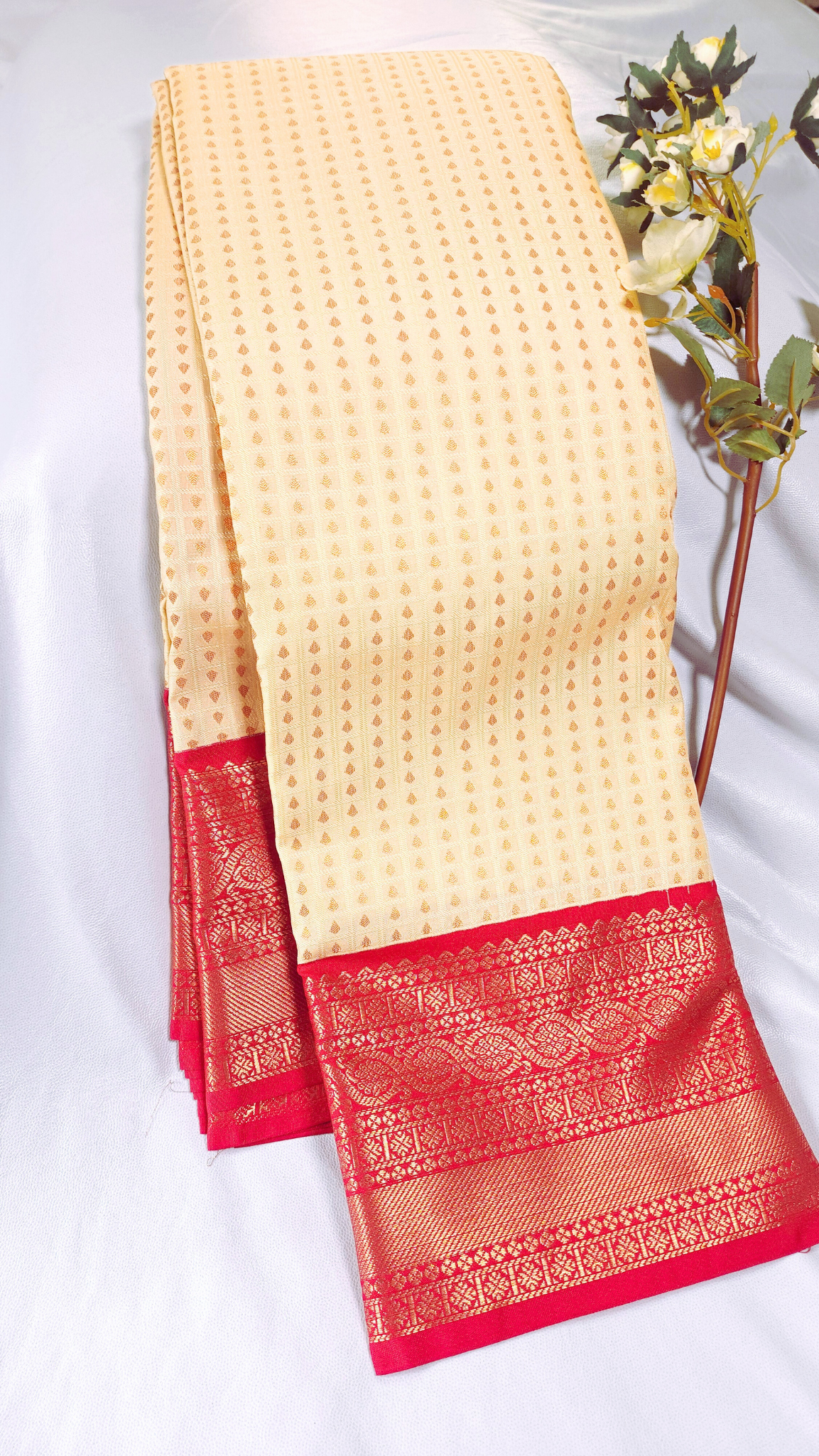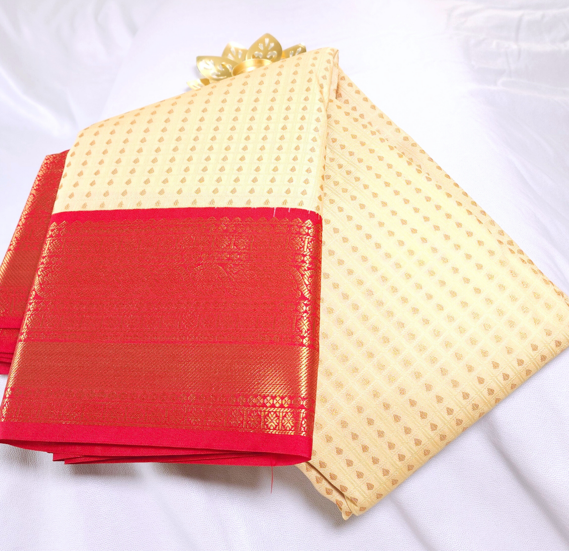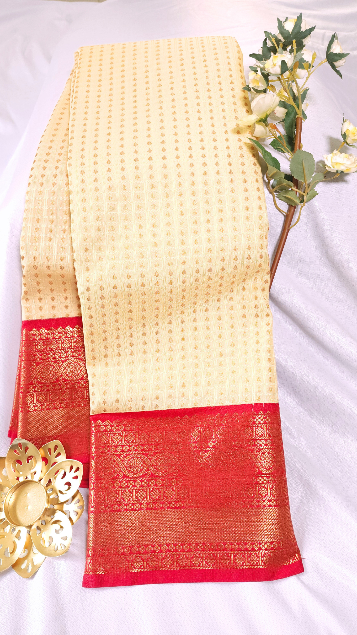 Beige | Vegan Silk Saree with Broad Red Zari Border