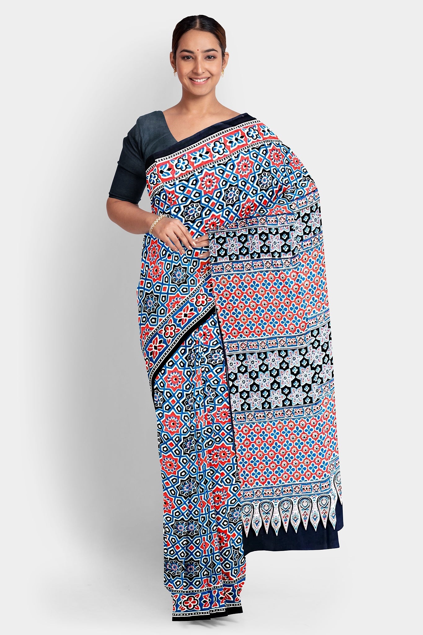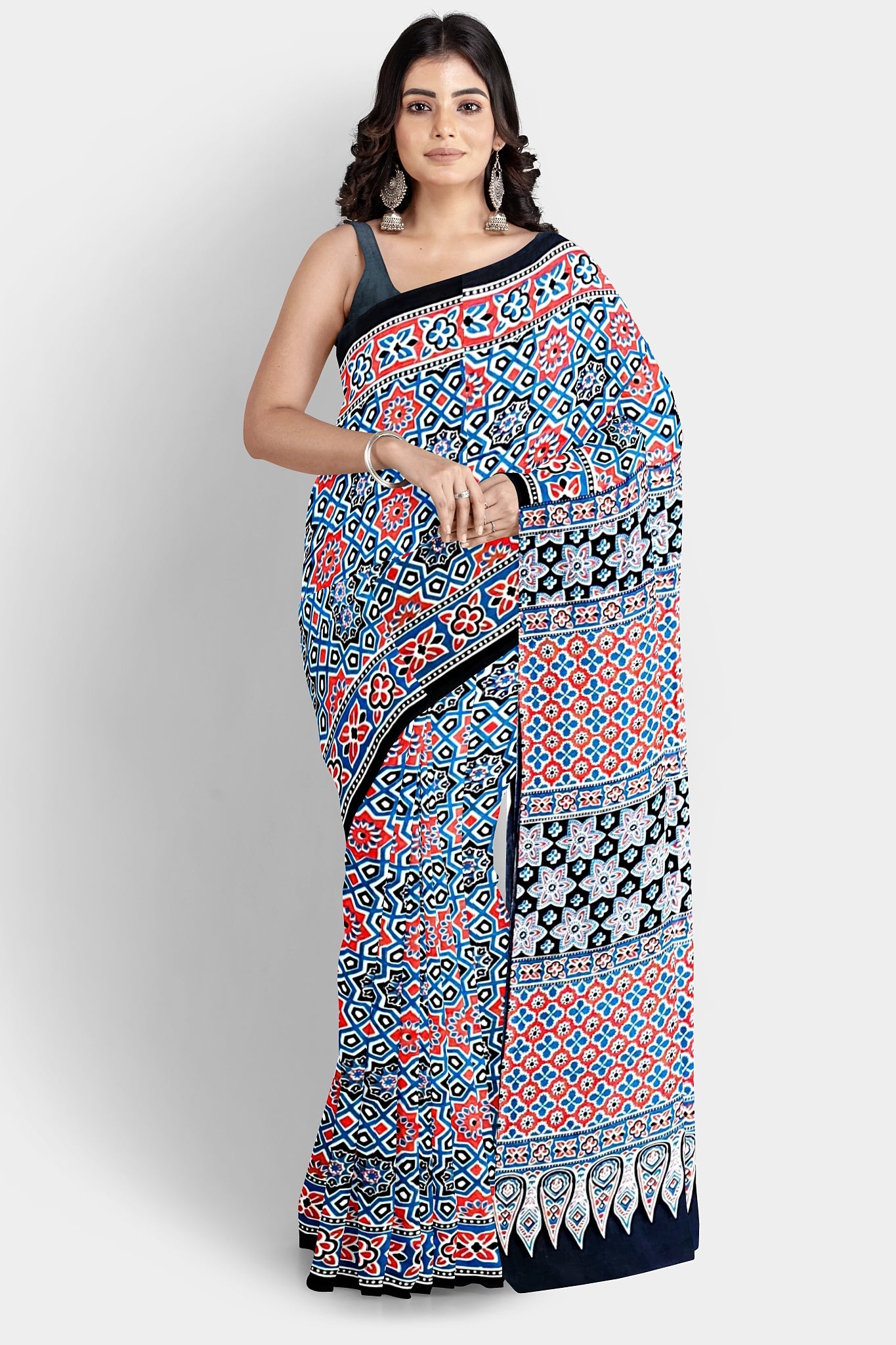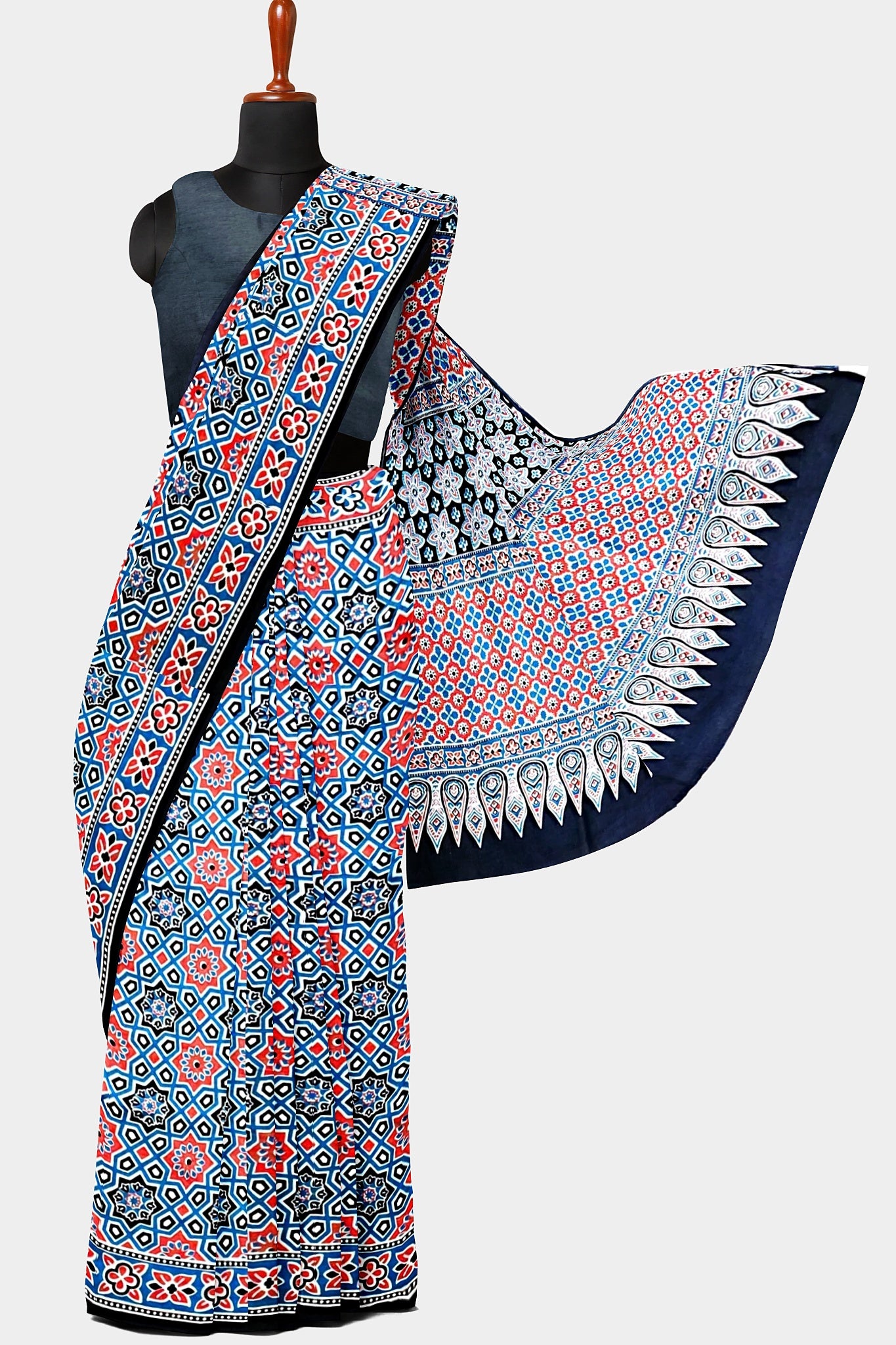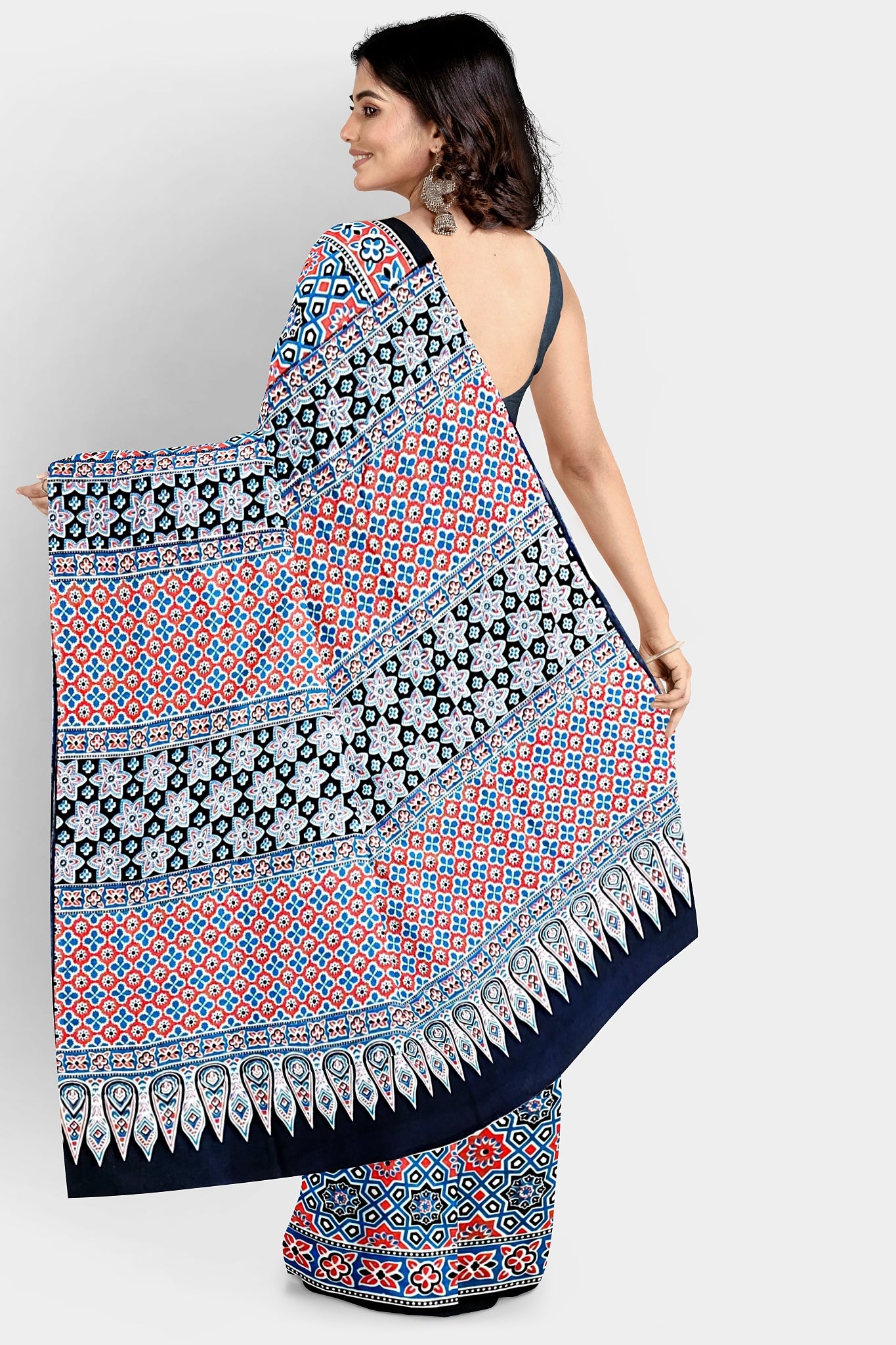 Blue & Red | Mul Mul Cotton Bagru Hand Block Printed Saree