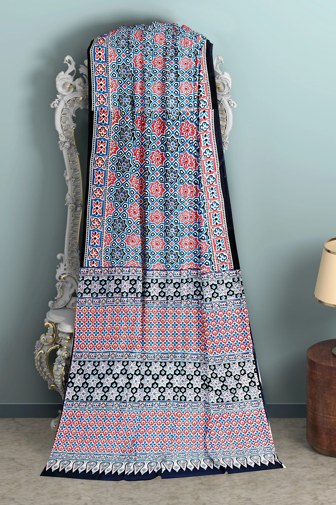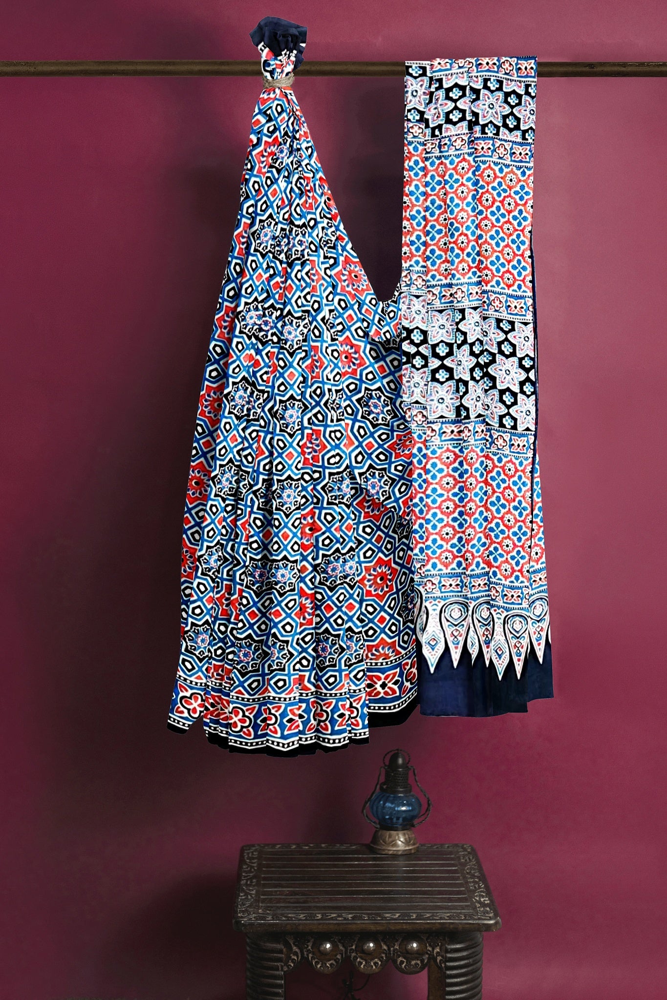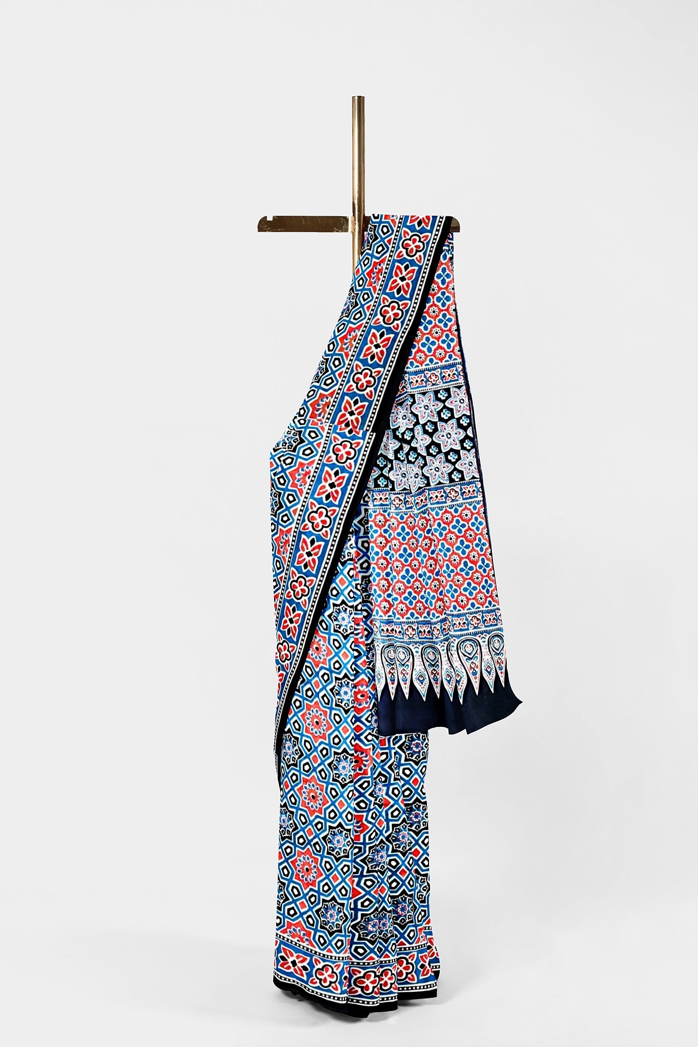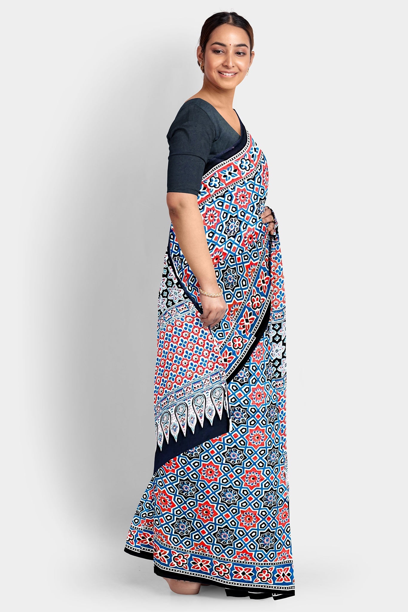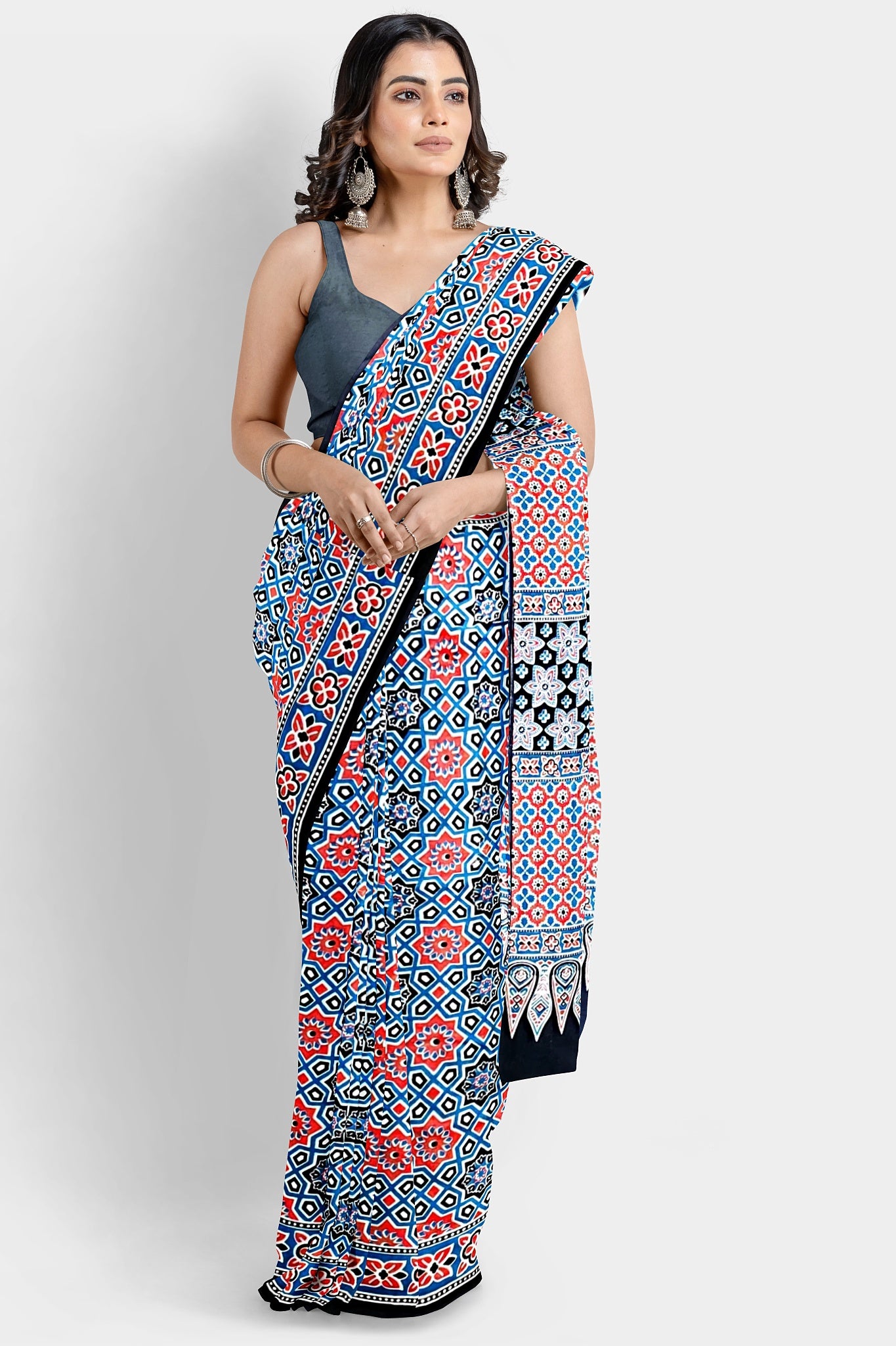Blue & Red | Mul Mul Cotton Bagru Hand Block Printed Saree