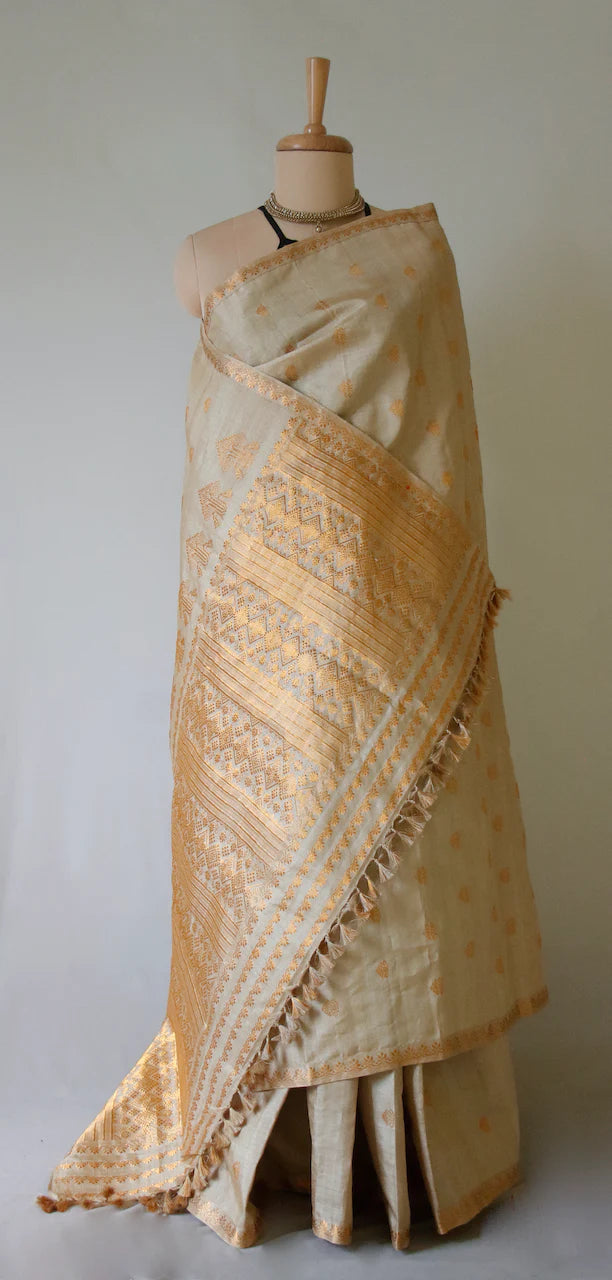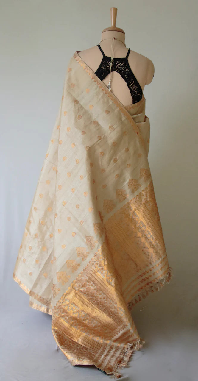 Golden | Pure Muga Silk Handloom Saree with Golden Zari Motifs-Silk Mark Certified