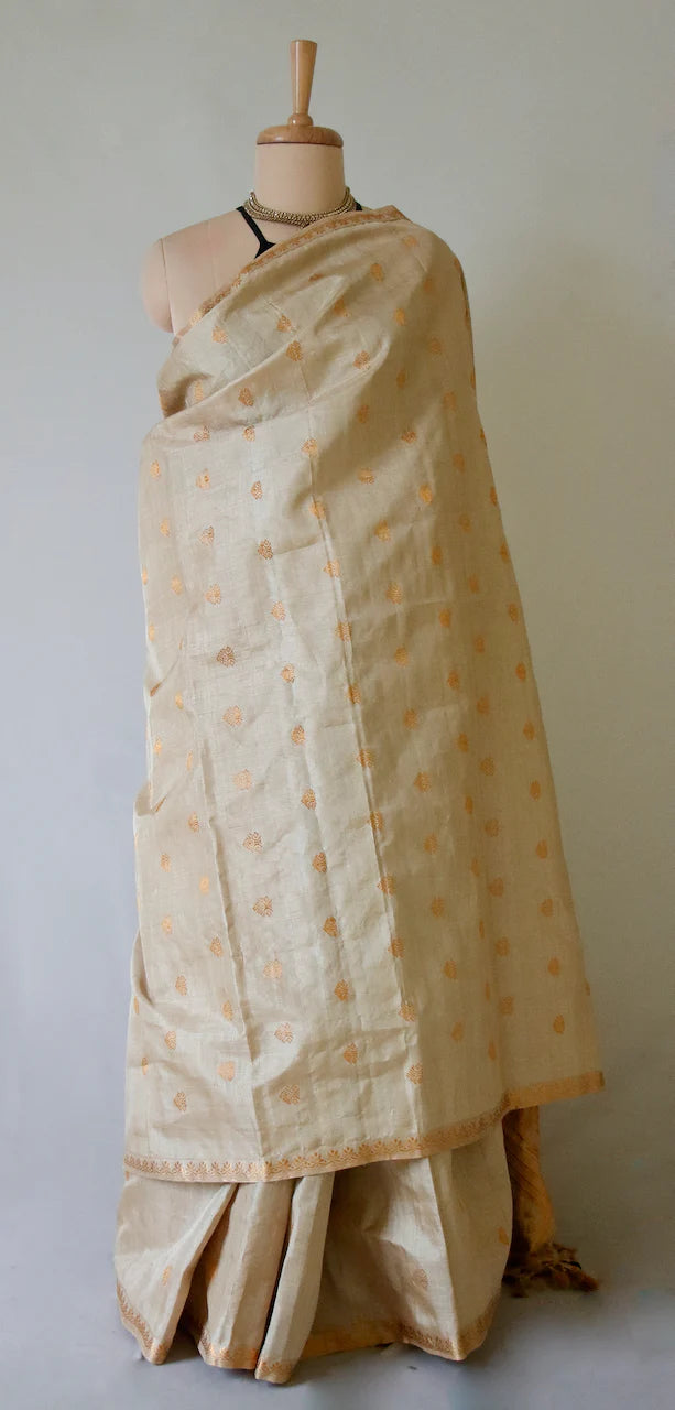 Introducing our Pure Muga Silk Sari, a masterpiece of luxury and tradition. The motifs are in golden tested zari .