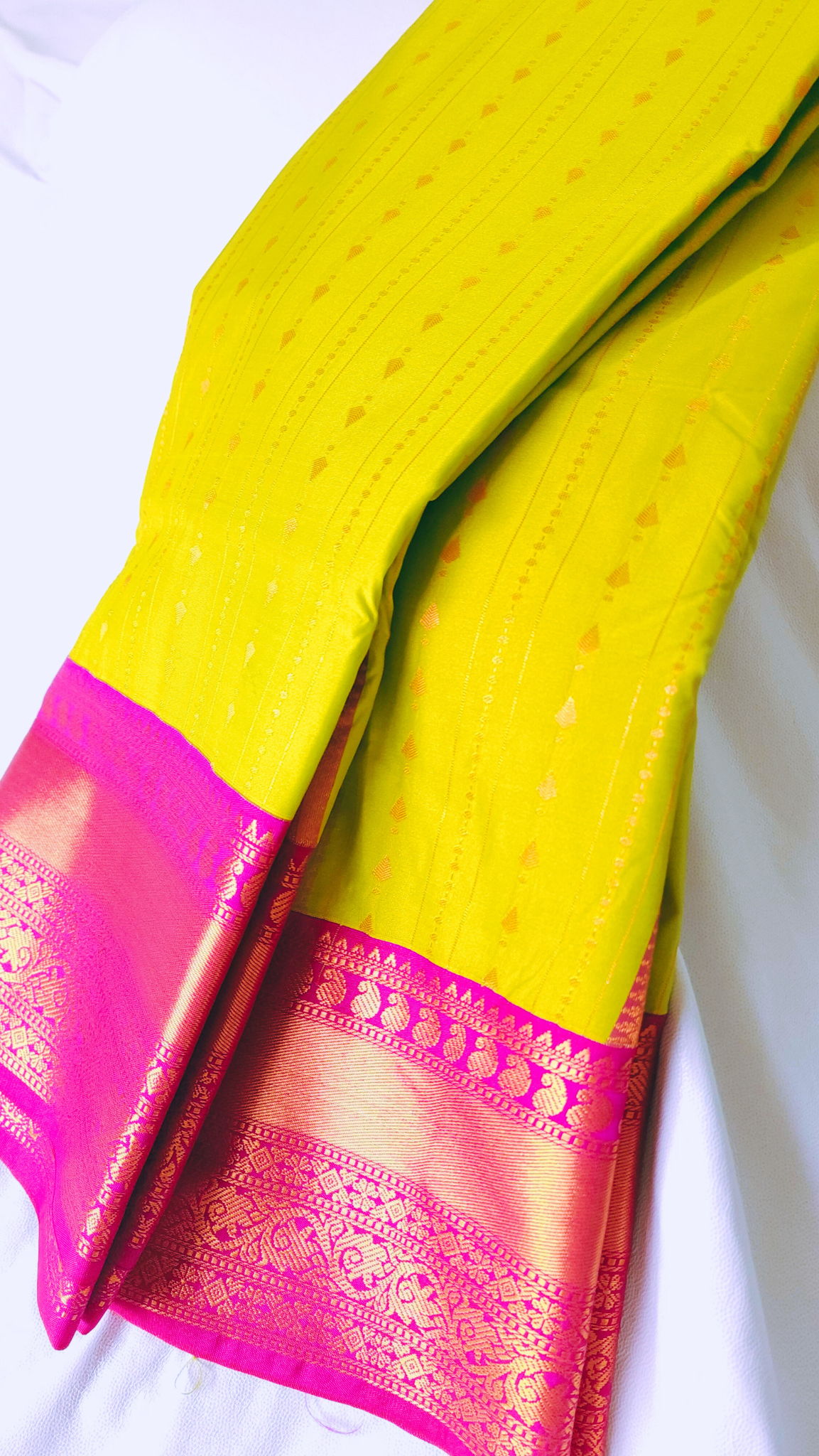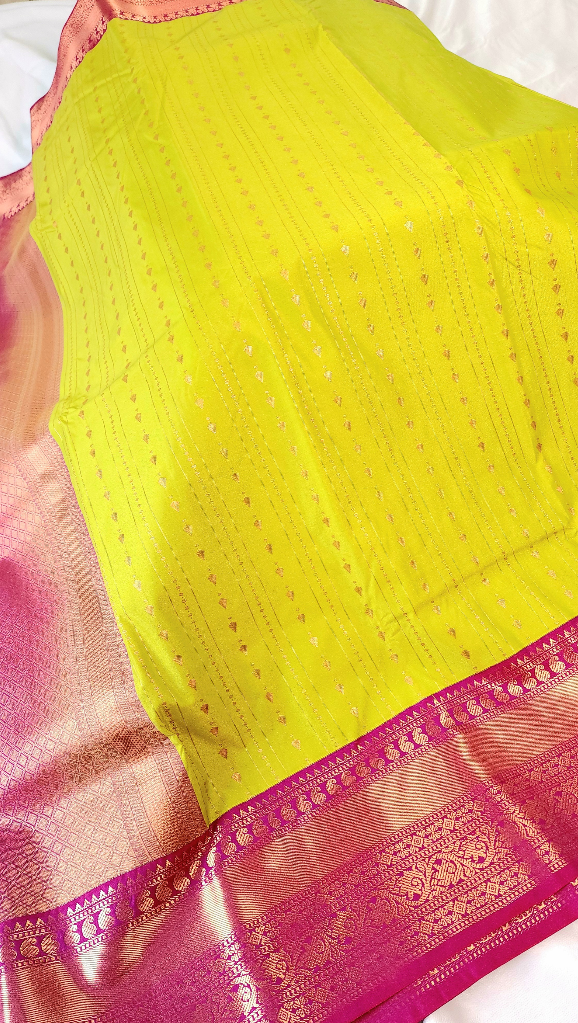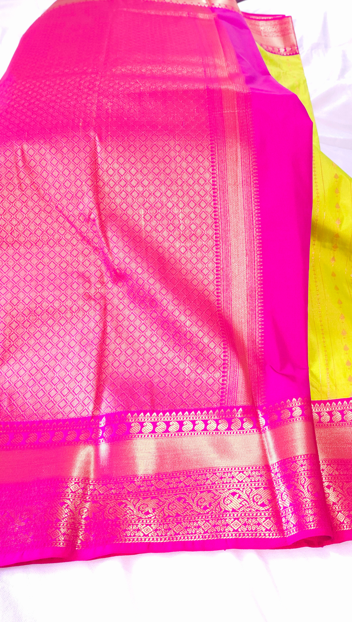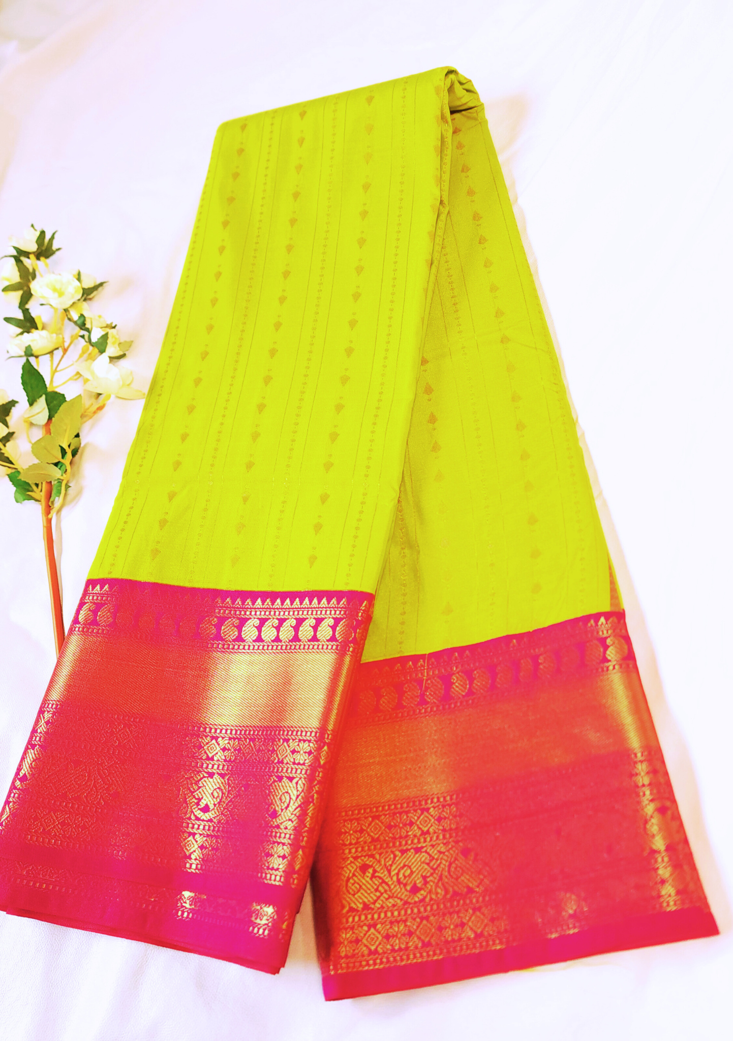 Lime Green | Vegan Silk Saree with Broad Pink Zari Border