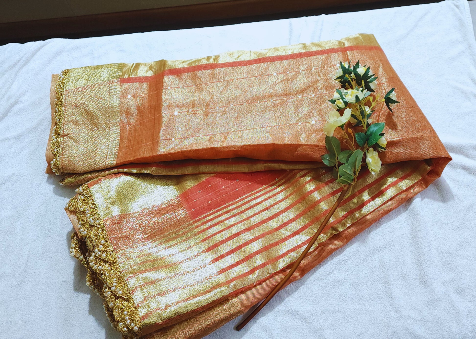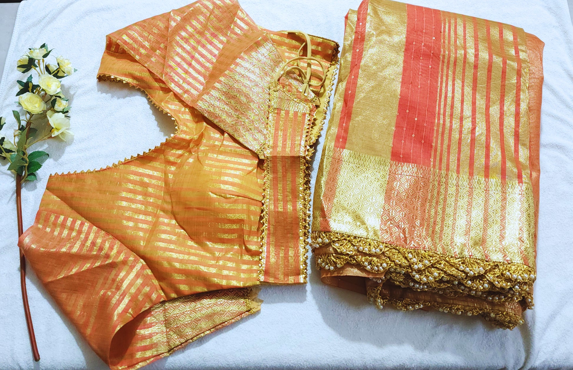 Peach & Golden | Cotton Silk Saree with Pearl & Gold Zari Border