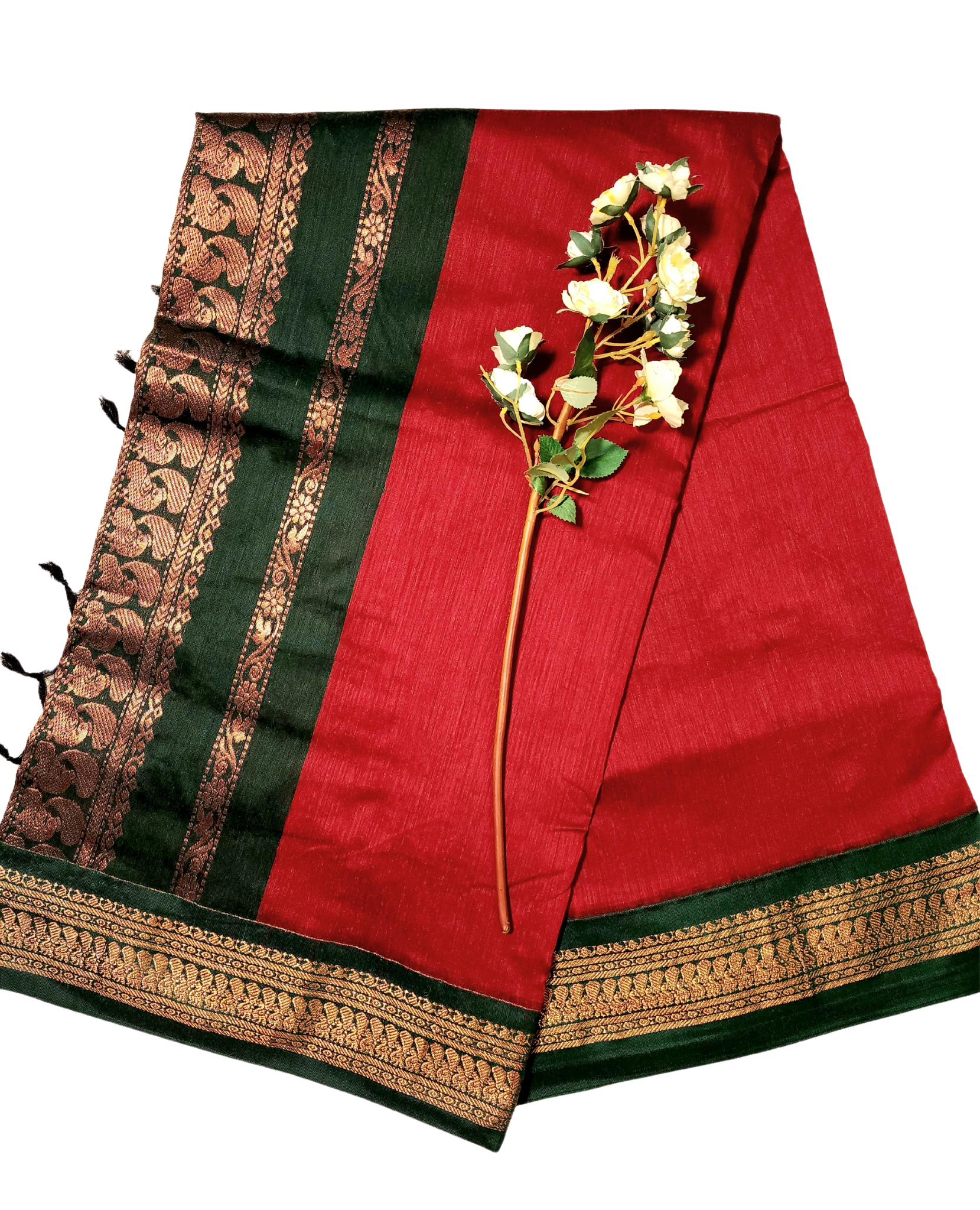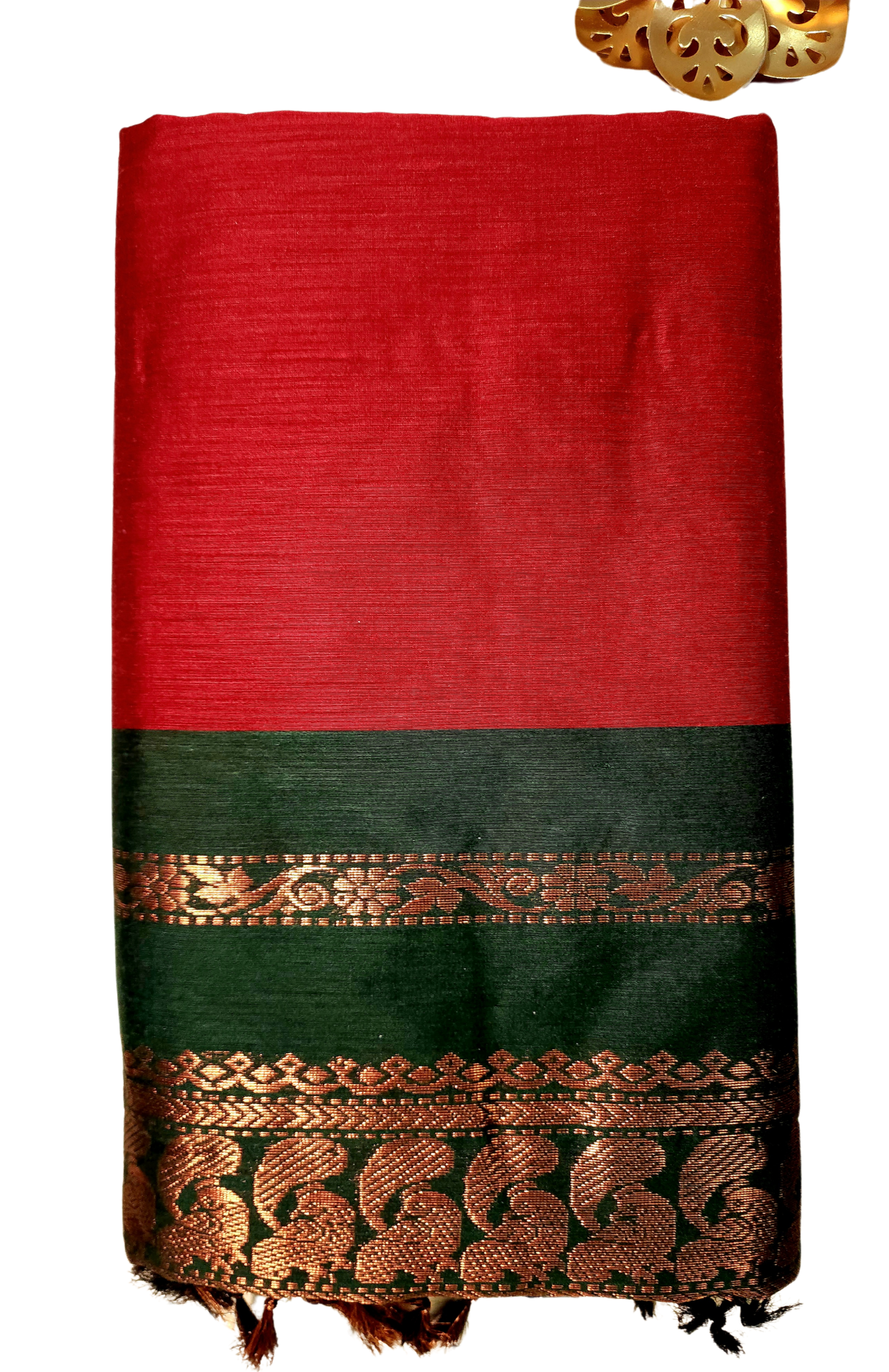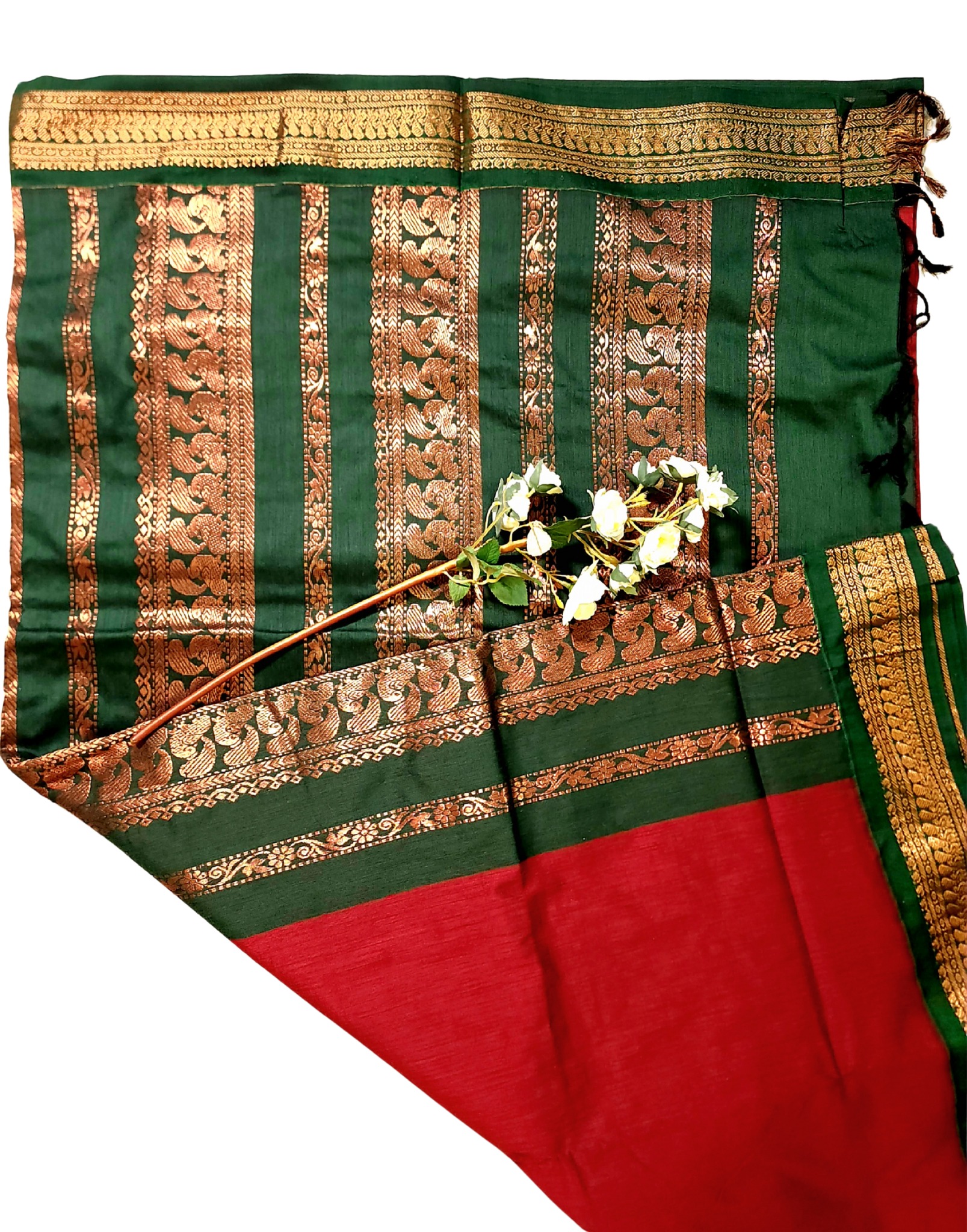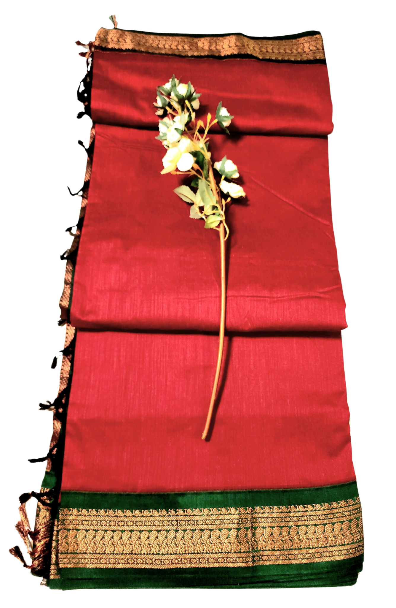 Red | Gadwal / Kalyani Cotton Silk Sarees Handloom Saree with Green Zari Border