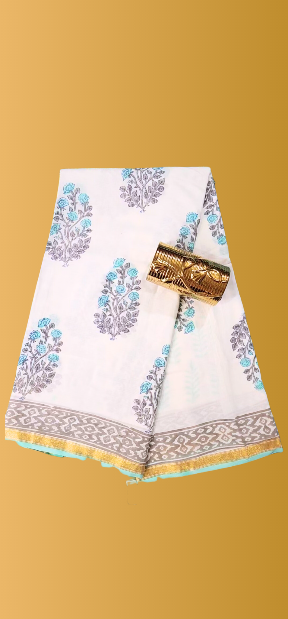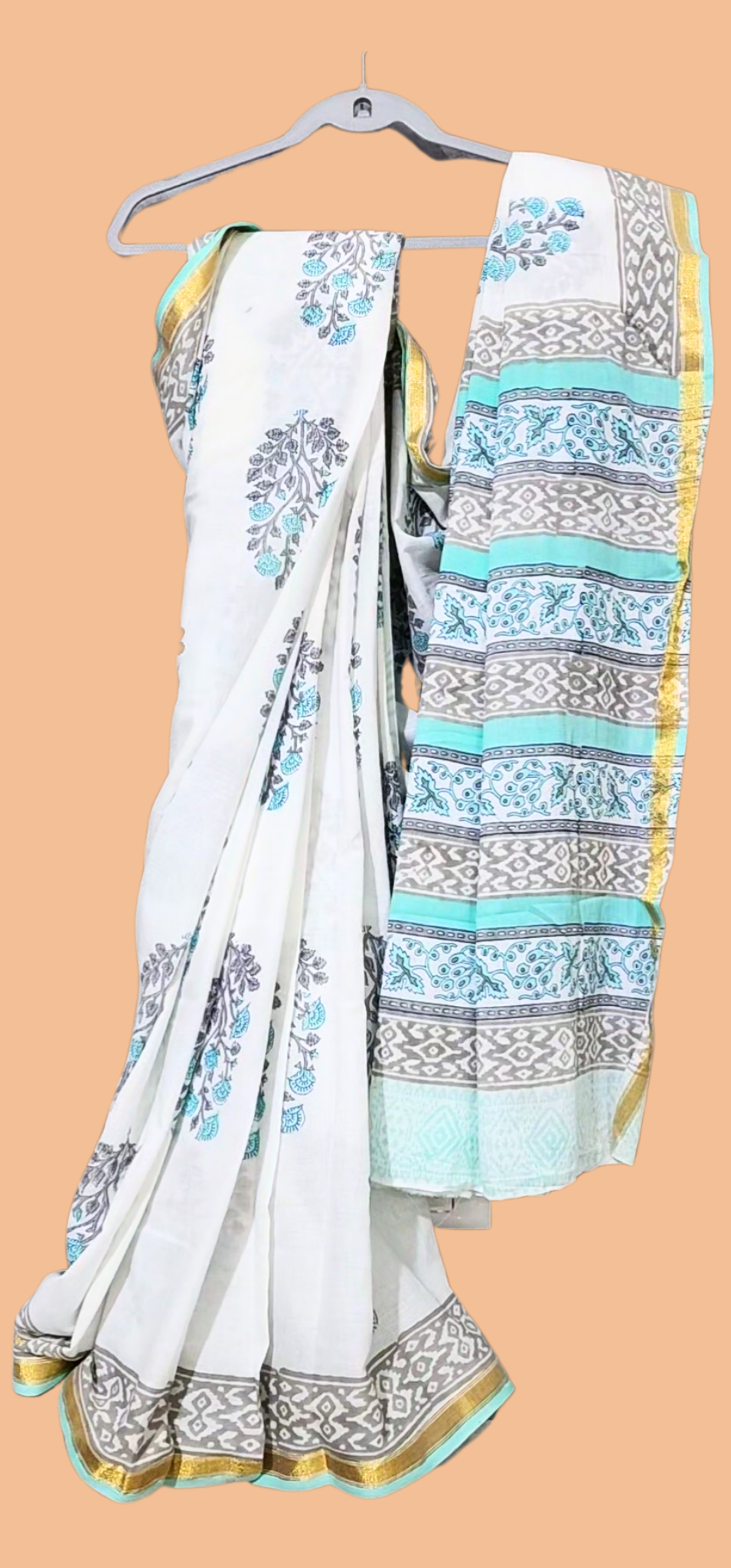 Elevate your style with our Cotton Saree with Zari Border. This exquisite saree is crafted from soft cotton fabric, ensuring comfort and breathability. The elegant zari border adds a touch of glamour and sophistication. Perfect for any occasion, this saree effortlessly blends traditional beauty and modern style in a stunning six-yard ensemble.