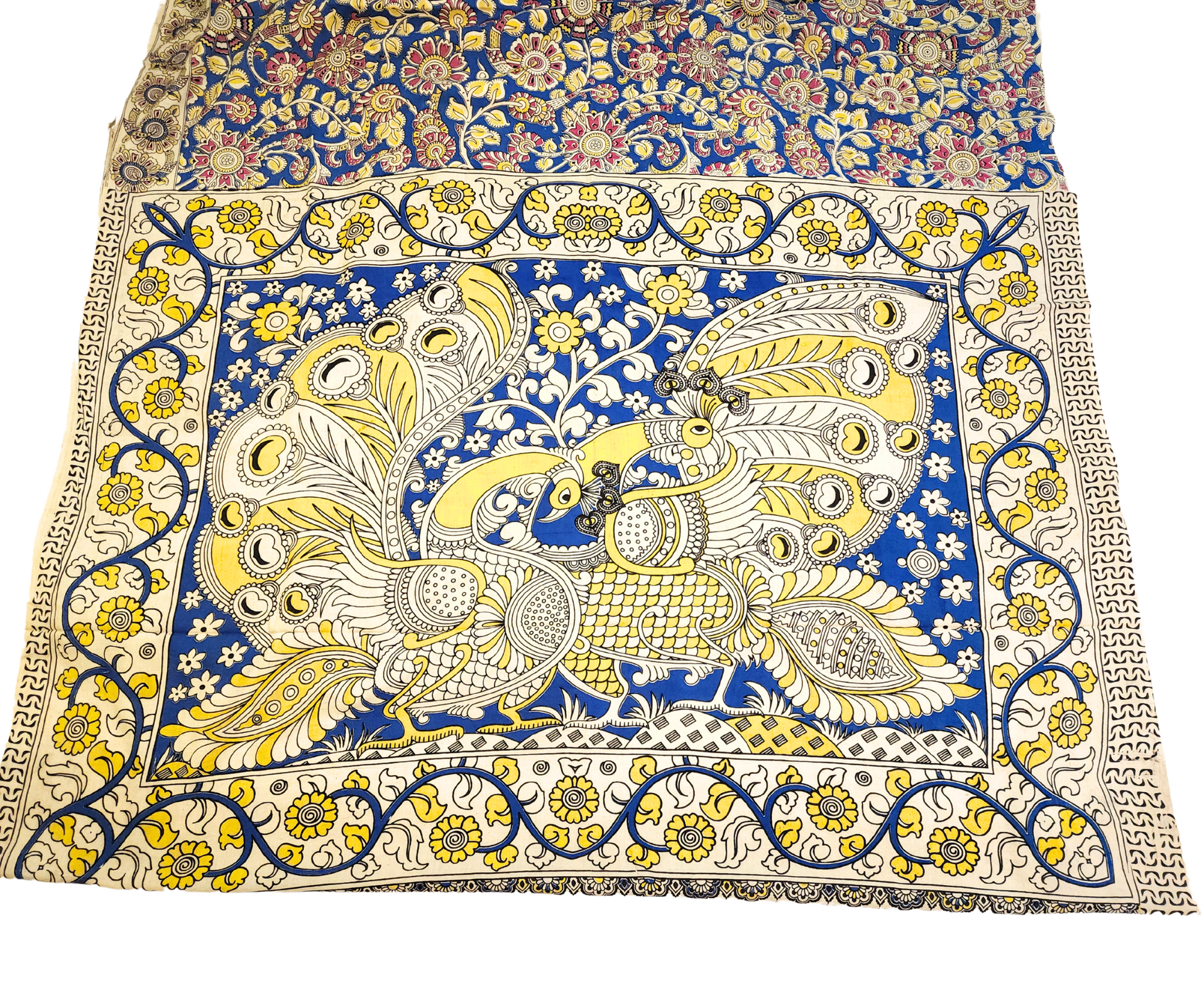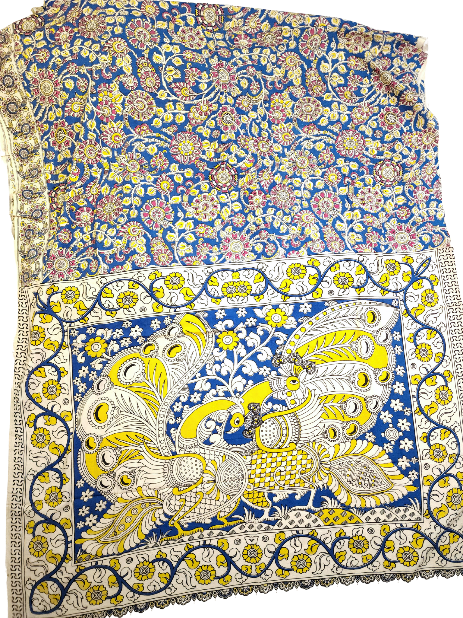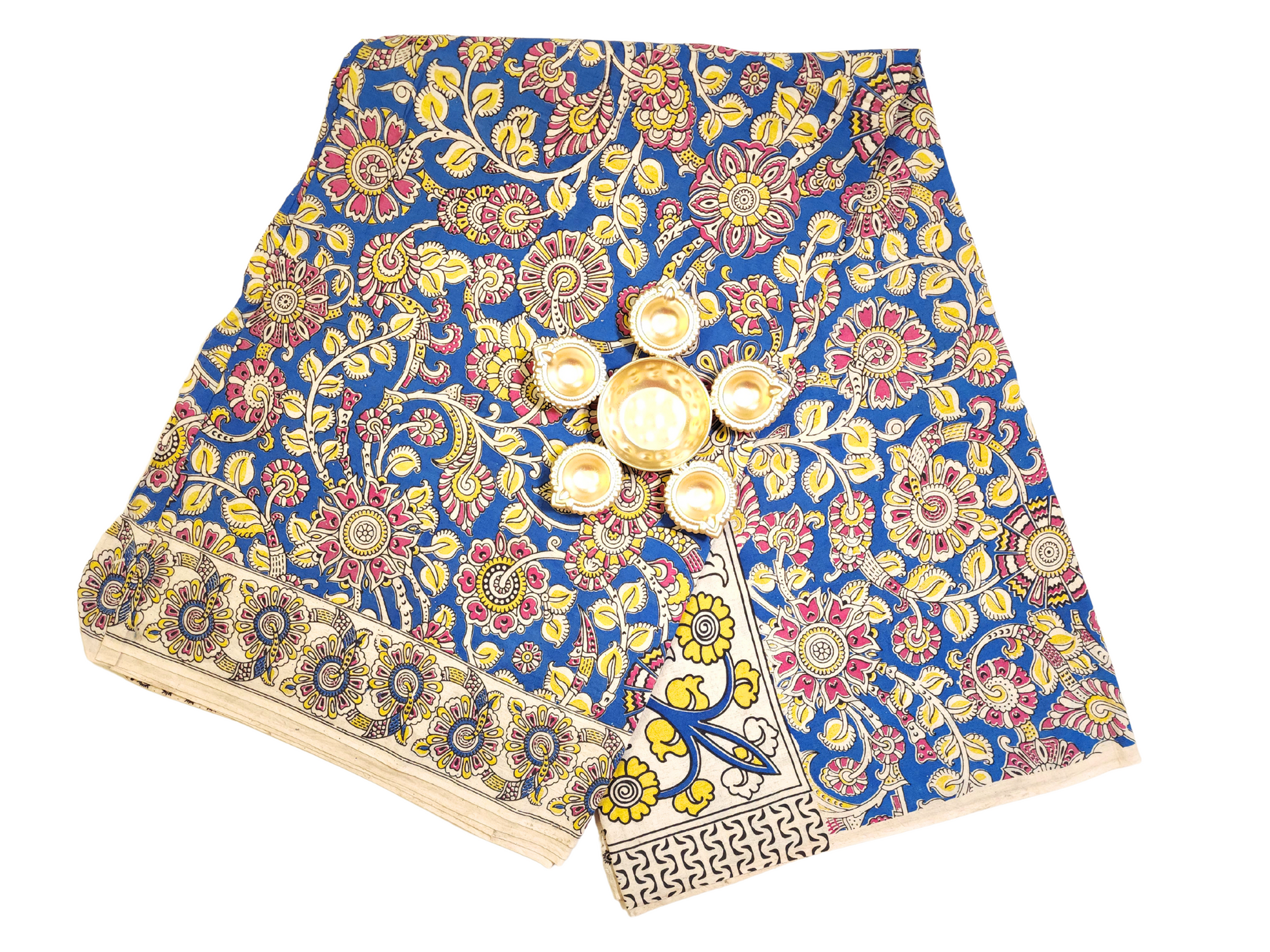 Yellow & Blue Floral Print | Mul Mul Cotton Handmade Pedana Kalamkari Saree