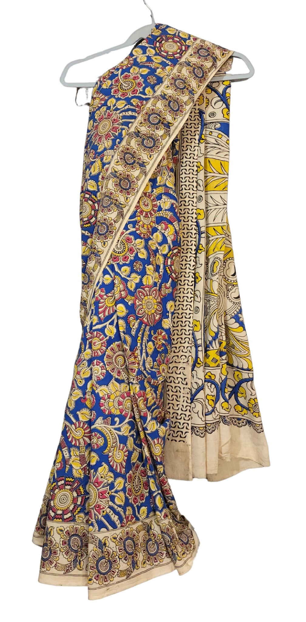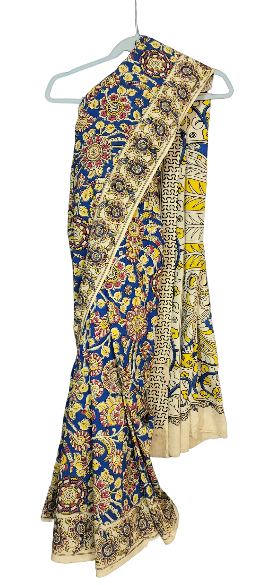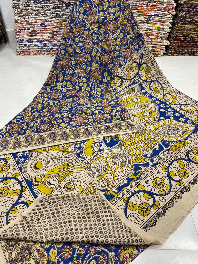 Yellow & Blue | Mul Mul Cotton Handmade Pedana Kalamkari Saree